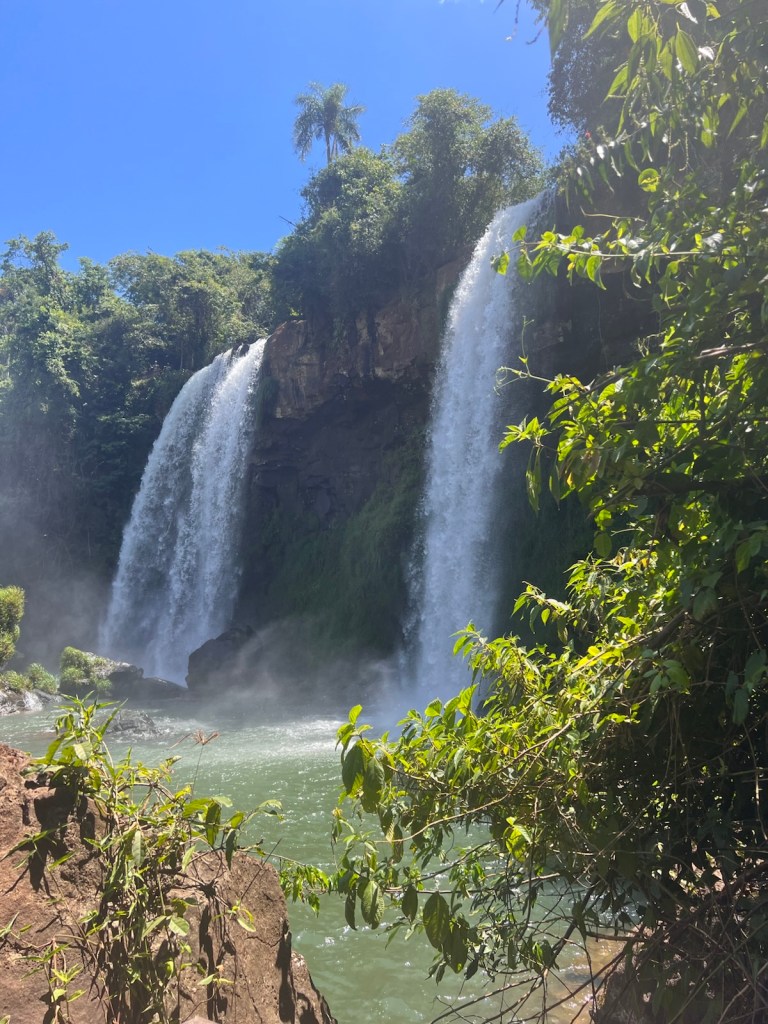 Devil’s Throat on the Brazilian side where 20% of the Falls are located. All of the water to the falls comes from rain water. Can’t you just close your eyes and hear the roar of the water? Interesting and time consuming experience going through border immigration when entering & exiting Brazil from Argentina. A story for another time.
