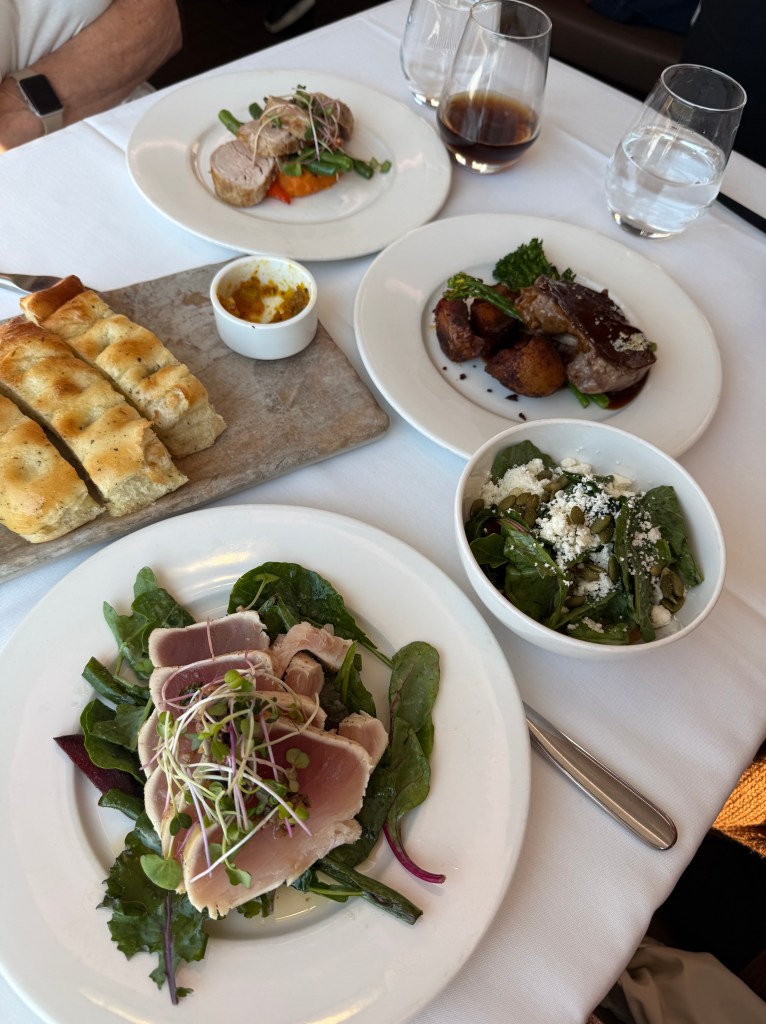 Lunch 1st day: Seared tuna, pork tenderloin, steak. Focaccia & hummus & eggplant dip.