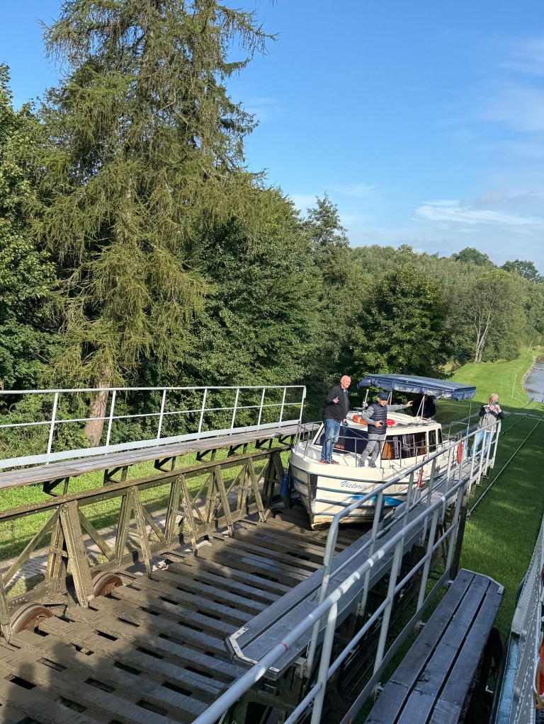 25 meter ramp on which the boat makes its way to other side to reach the canal to continue sailing. The boat is lifted out of the water & placed onto tracks & dragged across the land. One of four we experienced today. Opened in late 19th century & used for transportation of goods. After railroad completed & took commerce from the canal, it became a tourist attraction & remains so today.