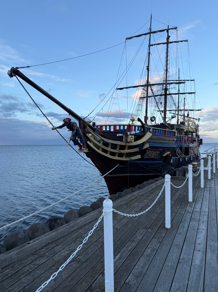 Pirate ship parked along the longest wooden pier in Europe, Sopot Molo which stretches out into the Baltic Sea.